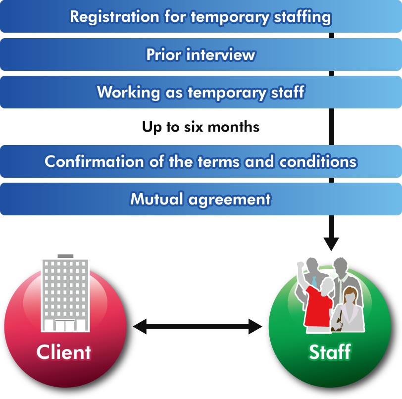 The Temporary Staffing System is a system where temporary workers are dispatched to a company (client) for work after executing an employment agreement with a temporary staffing agency. Supervision and instruction regarding the work will be provided by the client.