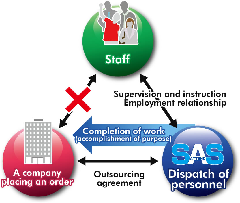 The Outsourcing System is a system where we receive an order for work, complete the work, and then receive payment for the work. The employment relationship is established, and supervision and instruction are provided by the dispatch company.